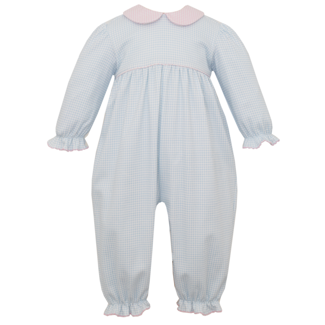 Light Blue Gingham Knit Long Bubble with Pink Collar