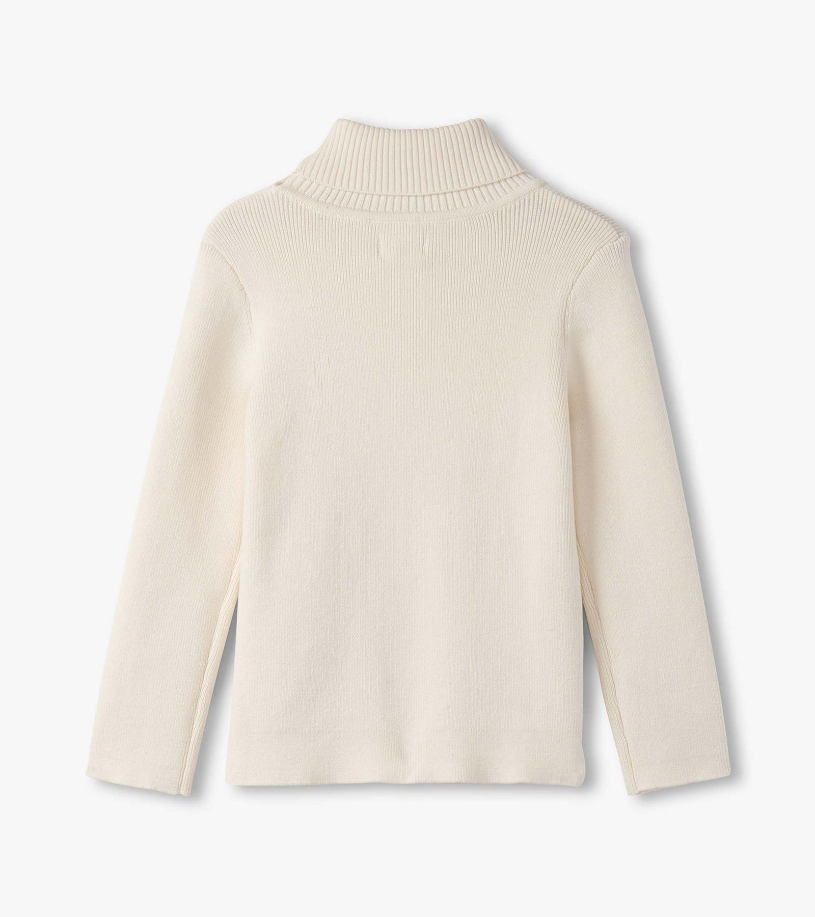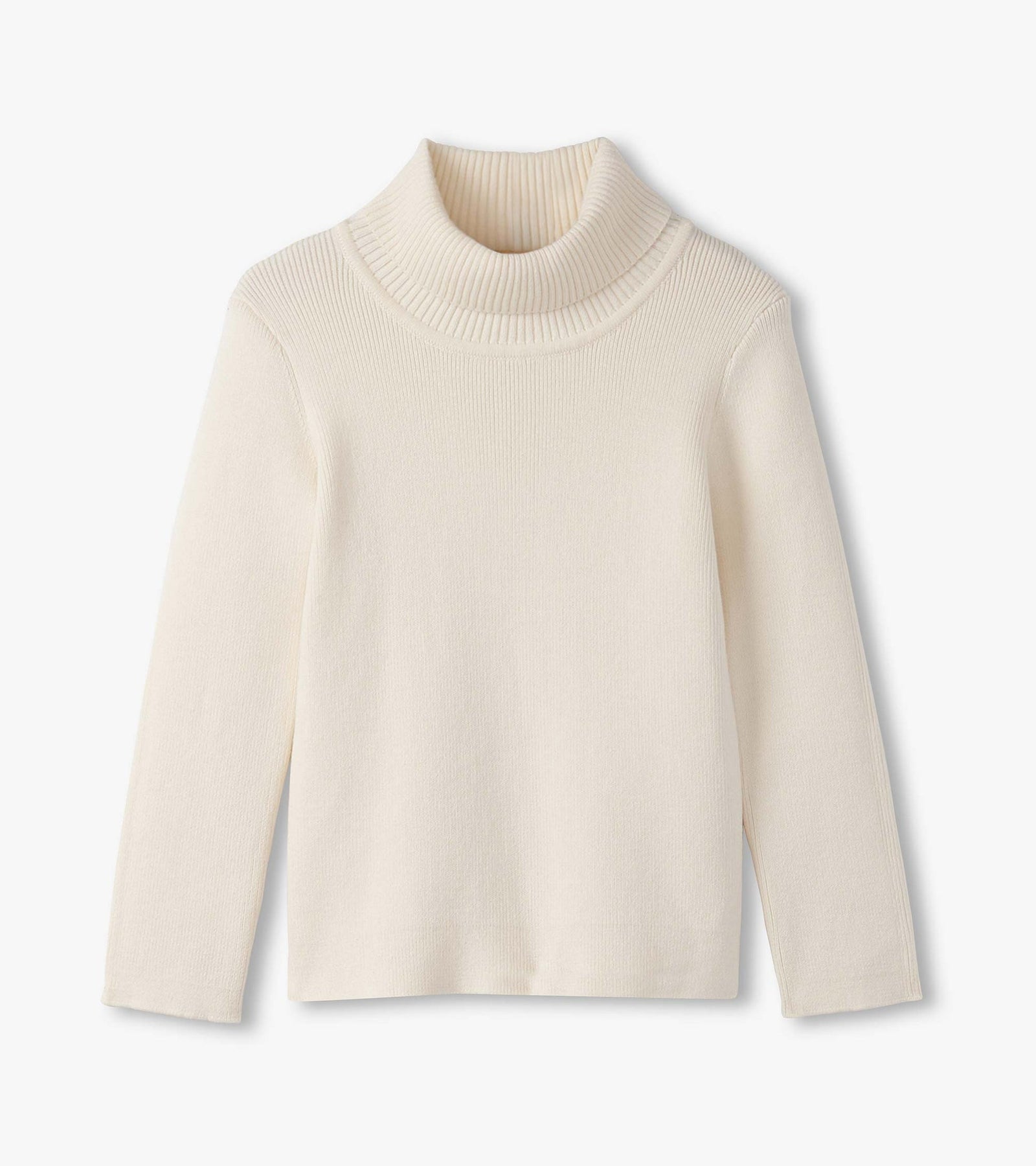 The Girls Cream Turtleneck in Natural is a cozy rib-knit top made from a super-soft cotton blend with a hint of glittering metallic fibers for a subtle shimmer. Designed with a classic single turtleneck collar, side seam slits, and long sleeves, it offers both warmth and elegance. Its natural hue makes it a versatile staple, perfect for layering or wearing solo as a softly sparkling statement piece.