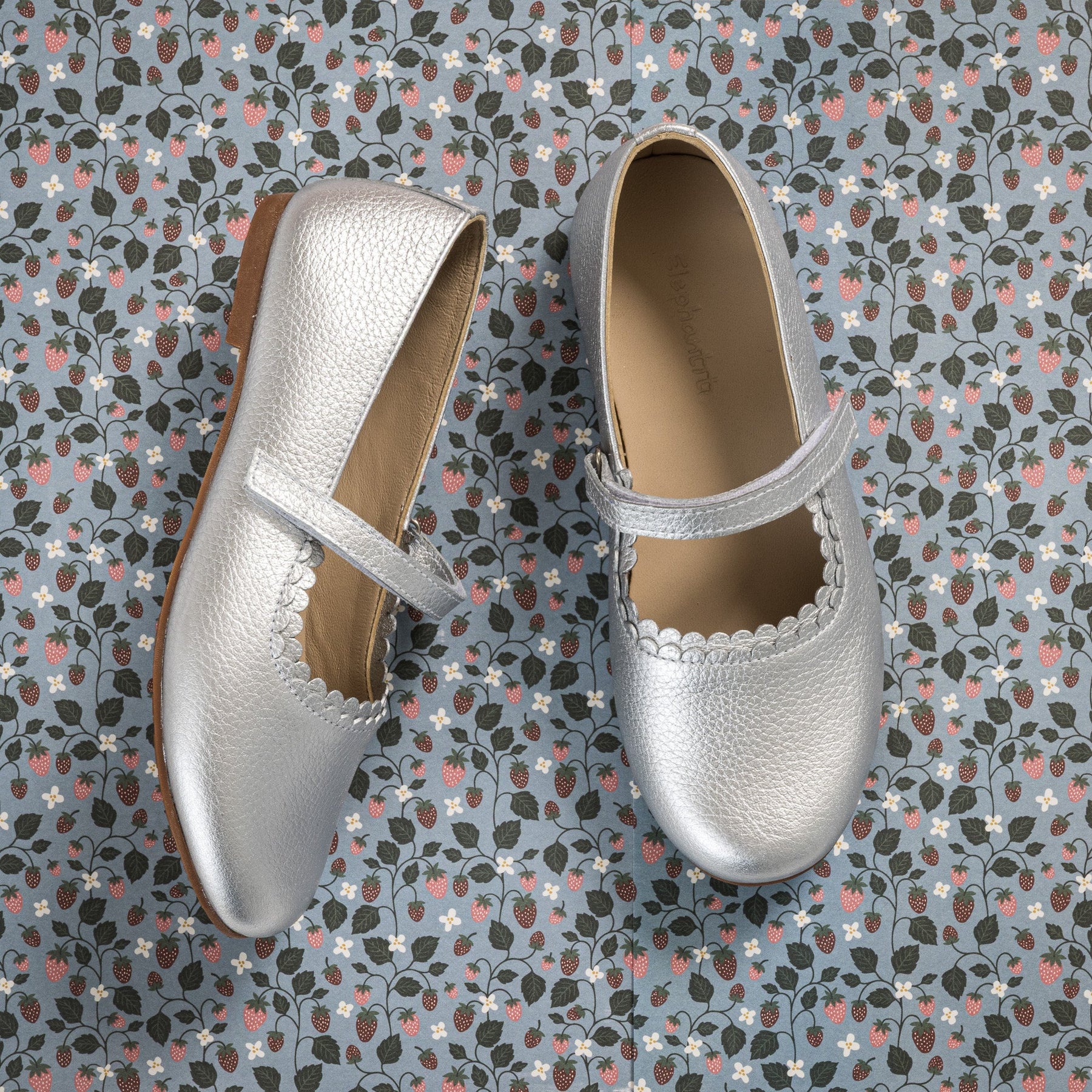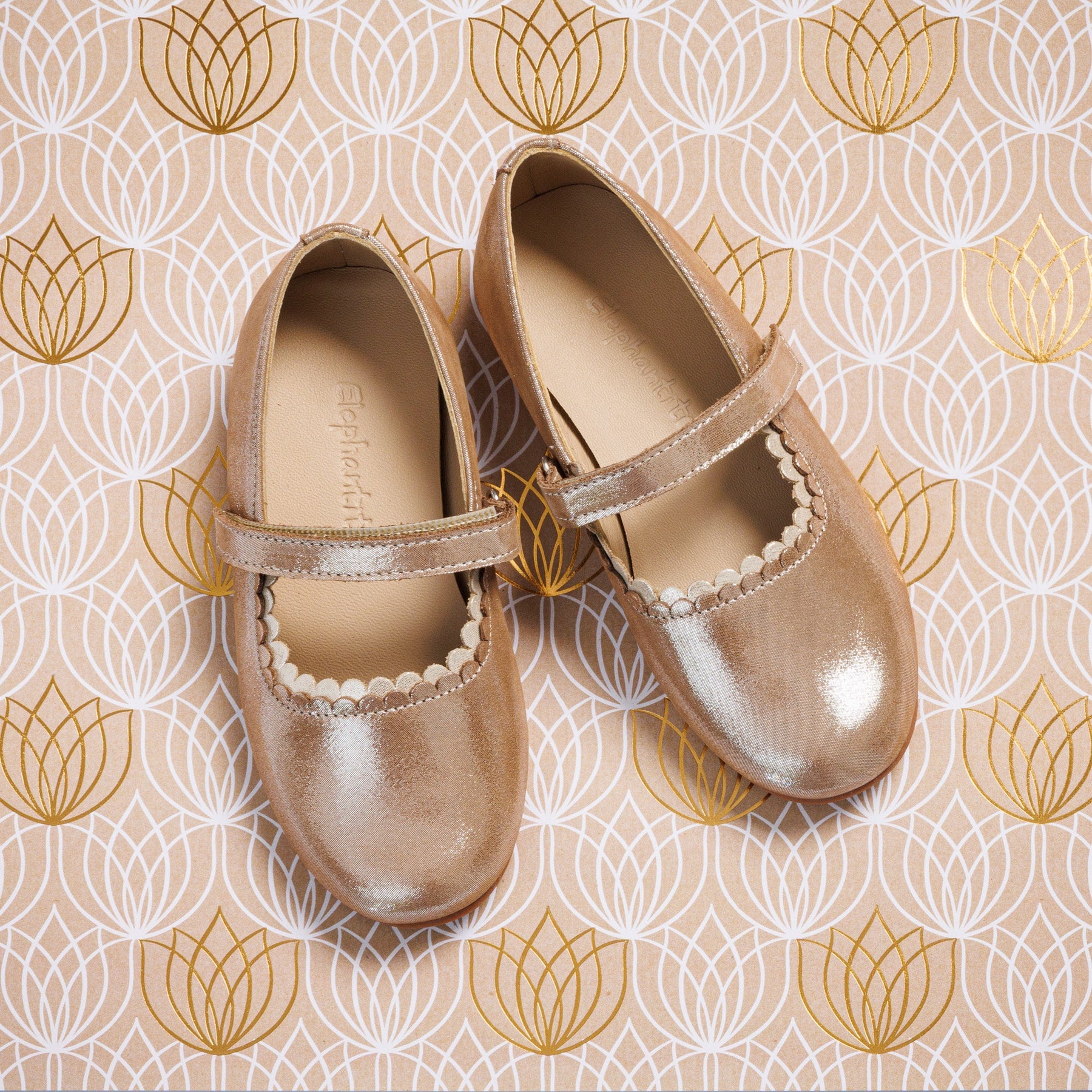 Patent calfskin ballerina with double scalloped trim, Velcro strap, leather lining, cushioned insole, and flexible sole.