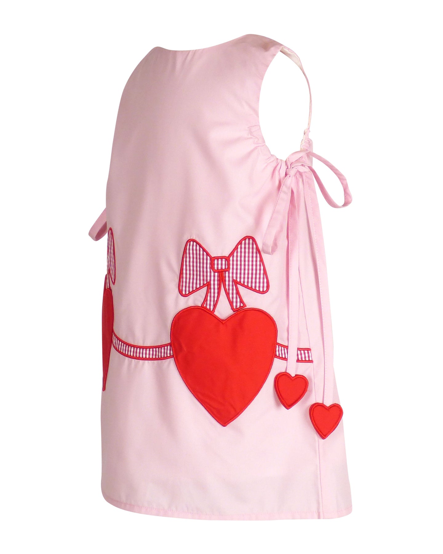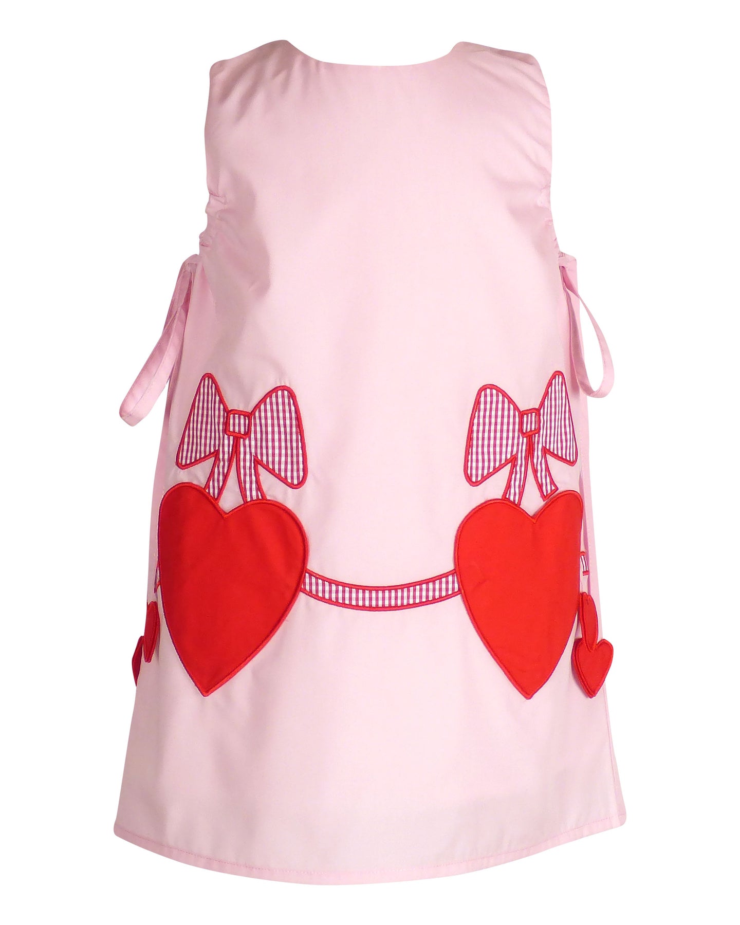 Pink A-line jumper with hearts under each arm for an adjustable fit. Fully lined, front heart pockets and one button closure in back.