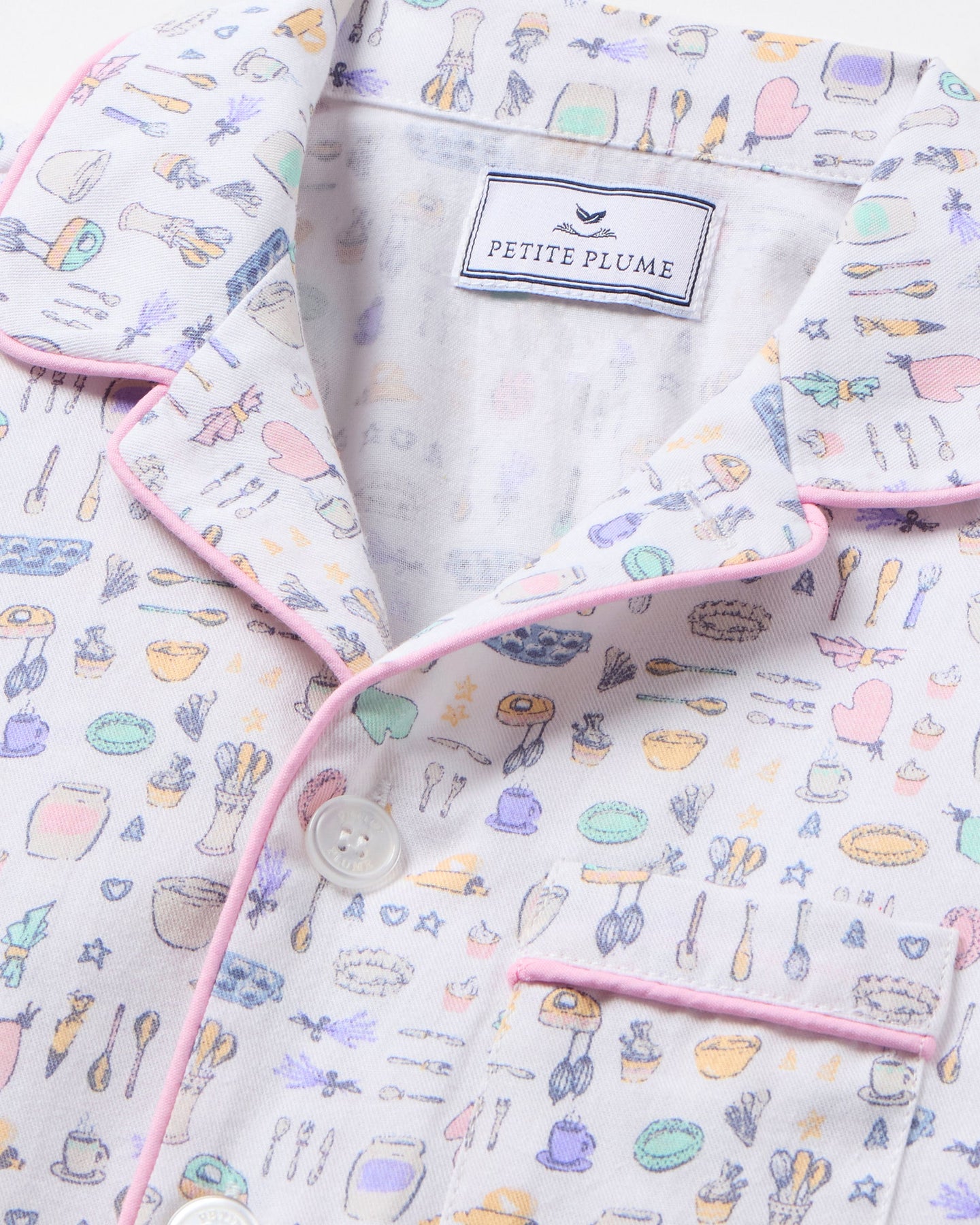 The perfect pajamas for bonding over family recipes. This hand-illustrated print has all the tools you'll need for perfecting pastries, cookies, and gingerbread houses. This classic, clean-lined pajama set is an instant keepsake to pass down for generations. The twill design is comfortable and durable, with sweet touches like logo buttons and crisp piping. Colors stay true after multiple washes, so you can rest easy knowing it'll remain a wardrobe favorite.