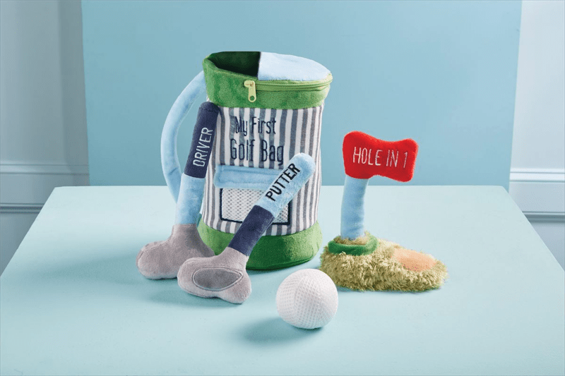 Get your golfing buddy started early with this golf bag plush toy set. The interactive so-soft plush golf bag holds plush golf ball, driver, putter and putting green. The set comes with kid friendly crinkle and rattle noises for hours of imaginary play. The front of the bag reads "My First Golf Bag".